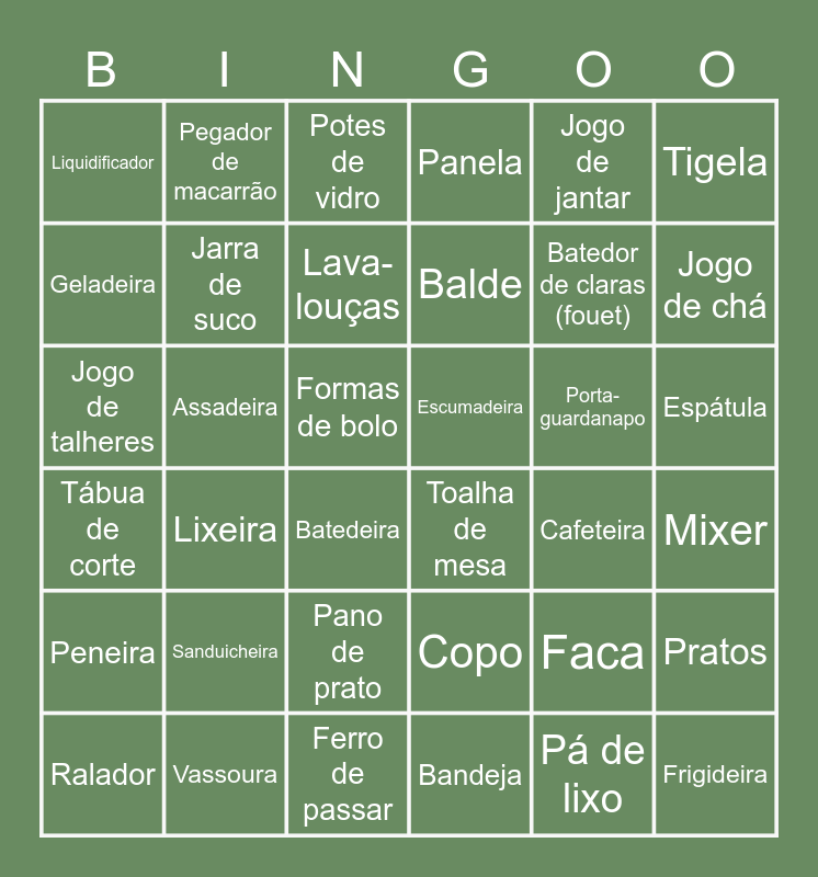 This bingo card has 56 words: Free!, Batedeira, Torradeira, Liquidificador, Cafeteira, Micro-ondas, Geladeira, Fogão, Lava-louças, Máquina de lavar, Panela, Frigideira, Faca, Copo, Xícara, Pratos, Jogo de jantar, Jogo de chá, Jogo de panelas, Jogo de talheres, Assadeira, Ralador, Tábua de corte, Potes de vidro, Abridor de latas, Jarra de suco, Pano de prato, Luva de cozinha, Balde, Vassoura, Rodo, Pá de lixo, Escorredor de louça, Coador de café, Formas de bolo, Tigela, Batedor de claras (fouet), Concha, Escumadeira, Pegador de macarrão, Espátula, Peneira, Abridor de garrafa, Medidor de cozinha, Saleiro e pimenteiro, Porta-guardanapo, Toalha de mesa, Jogo americano, Bandeja, Sanduicheira, Mixer, Ferro de passar, Tábua de passar, Aspirador de pó, Lixeira and Balança de cozinha.