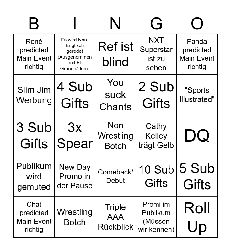 This bingo card has 25 words: New Day Promo in der Pause, Triple AAA Rückblick, You suck Chants, Chat predicted Main Event richtig, Panda predicted Main Event richtig, René predicted Main Event richtig, Slim Jim Werbung, Es wird Non-Englisch geredet (Ausgenommen mit El Grande/Dom), Cathy Kelley trägt Gelb, Comeback/ Debut, 2 Sub Gifts, 3 Sub Gifts, 10 Sub Gifts, 5 Sub Gifts, 4 Sub Gifts, Roll Up, DQ, Ref ist blind, "Sports Illustrated", 3x Spear, Non Wrestling Botch, Wrestling Botch, Publikum wird gemuted, NXT Superstar ist zu sehen and Promi im Publikum (Müssen wir kennen).