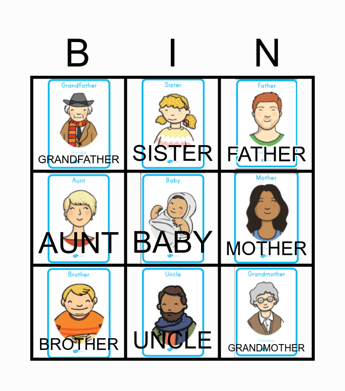 This bingo card has 8 images, a free space and 8 words: MOTHER, FATHER, SISTER, BROTHER, GRANDFATHER, GRANDMOTHER, AUNT and UNCLE.