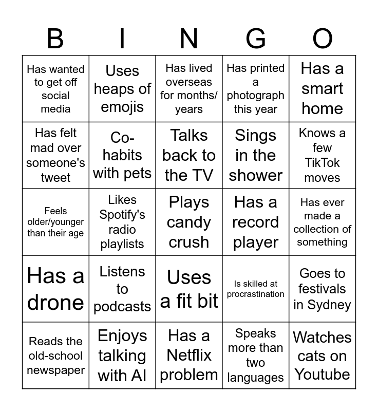 This bingo card has 25 words: Listens to podcasts, Has a Netflix problem, Talks back to the TV, Reads the old-school newspaper, Has a smart home, Has wanted to get off social media, Has felt mad over someone's tweet, Uses heaps of emojis, Has a record player, Uses a fit bit, Sings in the shower, Feels older/younger than their age, Is skilled at procrastination, Goes to festivals in Sydney, Co-habits with pets, Watches cats on Youtube, Has ever made a collection of something, Has lived overseas for months/ years, Knows a few TikTok moves, Likes Spotify's radio playlists, Plays candy crush, Enjoys talking with AI, Has a drone, Has printed a photograph this year and Speaks more than two languages.