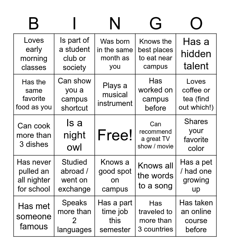 This bingo card has a free space and 24 words: Studied abroad / went on exchange, Speaks more than 2 languages, Plays a musical instrument, Has met someone famous, Has a hidden talent, Loves early morning classes, Has the same favorite food as you, Is part of a student club or society, Can recommend a great TV show / movie, Knows a good spot on campus, Has worked on campus before, Can cook more than 3 dishes, Knows all the words to a song, Has a pet / had one growing up, Can show you a campus shortcut, Has traveled to more than 3 countries, Shares your favorite color, Was born in the same month as you, Loves coffee or tea (find out which!), Is a night owl, Has taken an online course before, Has never pulled an all nighter for school, Knows the best places to eat near campus and Has a part time job this semester.
