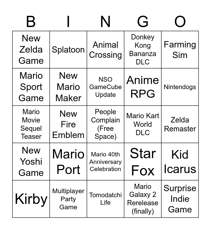 This bingo card has a free space and 25 words: Mario Port, Tomodatchi Life, NSO GameCube Update, Kirby, Farming Sim, New Zelda Game, Mario Sport Game, Splatoon, Mario Kart World DLC, Mario 40th Anniversary Celebration, Anime RPG, Mario Movie Sequel Teaser, Star Fox, Kid Icarus, New Mario Maker, Metroid Prime 4: Beyond Release Date, Zelda Remaster, Animal Crossing, Nintendogs, New Fire Emblem, Surprise Indie Game, Multiplayer Party Game, New Yoshi Game, Donkey Kong Bananza DLC and Mario Galaxy 2 Rerelease (finally).