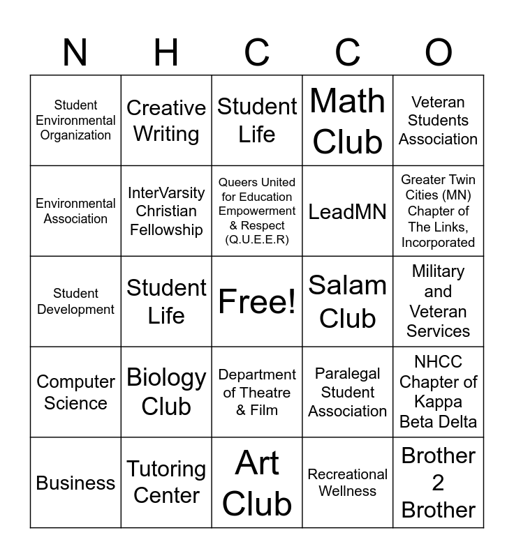 This bingo card has a free space and 46 words: Diversity Equity and Inclusion, Brother 2 Brother, Anime & Game Club, Art Club, Biology Club, Black Student Union, Creative Writing, GrooveVerse, Environmental Association, 8 Ball Crusaders, InterVarsity Christian Fellowship, Math Club, NHCC Chapter of Kappa Beta Delta, Paralegal Student Association, Phi Theta Kappa, Psychology Club, Queers United for Education Empowerment & Respect (Q.U.E.E.R), Salam Club, Student Nurses Association, Veteran Students Association, Student Life, Recreational Wellness, Student Environmental Organization, LeadMN, League of Women Voters, Greater Twin Cities (MN) Chapter of The Links, Incorporated, Business, Fine Arts, Department of Theatre & Film, Computer Science, English, Human Services, Paralegal, Education, Advising Center, Tutoring Center, Military and Veteran Services, TRIO/SSS, CARE Center, Food Cupboard, Access Services, Student Life, Student Development, Financial Aid, Upward Bound and University Partnerships (3 of 18).