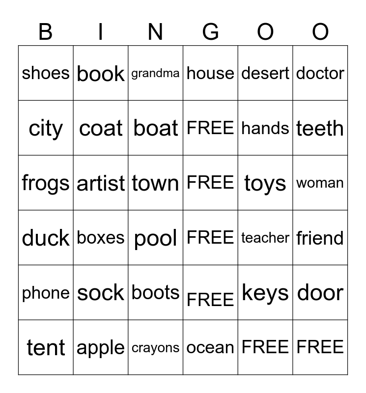 This bingo card has 36 words: FREE, boots, ocean, city, duck, FREE, coat, crayons, desert, keys, teeth, house, door, artist, FREE, shoes, phone, toys, frogs, grandma, town, boxes, FREE, pool, teacher, book, hands, apple, boat, doctor, FREE, tent, friend, woman, sock and FREE.
