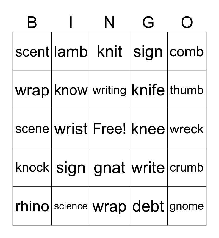 This bingo card has a free space and 24 words: sign, science, writing, rhino, comb, scent, wrap, lamb, knee, gnat, knife, scene, write, crumb, know, debt, wreck, knit, thumb, wrist, gnome, knock, sign and wrap.