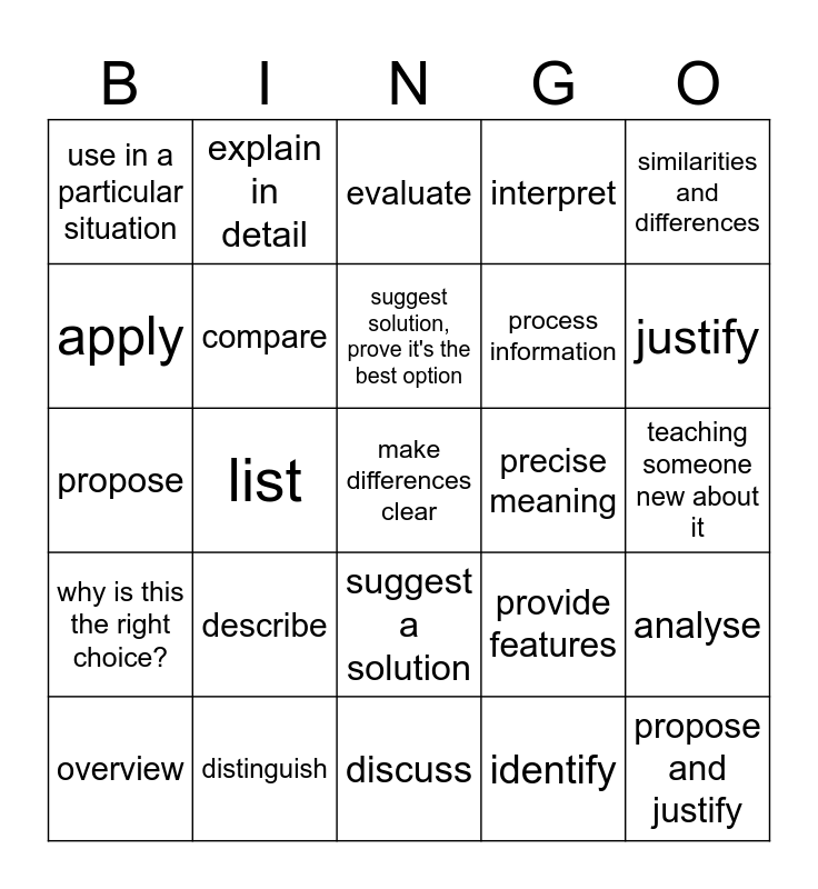 This bingo card has 32 words: identify, name it, list, list all parts, why is this the right choice?, compare, similarities and differences, analyse, explain in detail, propose and justify, suggest solution, prove it's the best option, evaluate, discuss plus your judgement at end, define, precise meaning, outline, overview, propose, suggest a solution, describe, provide features, explain, teaching someone new about it, distinguish, make differences clear, interpret, process information, apply, use in a particular situation, discuss, strengths and weaknesses and justify.