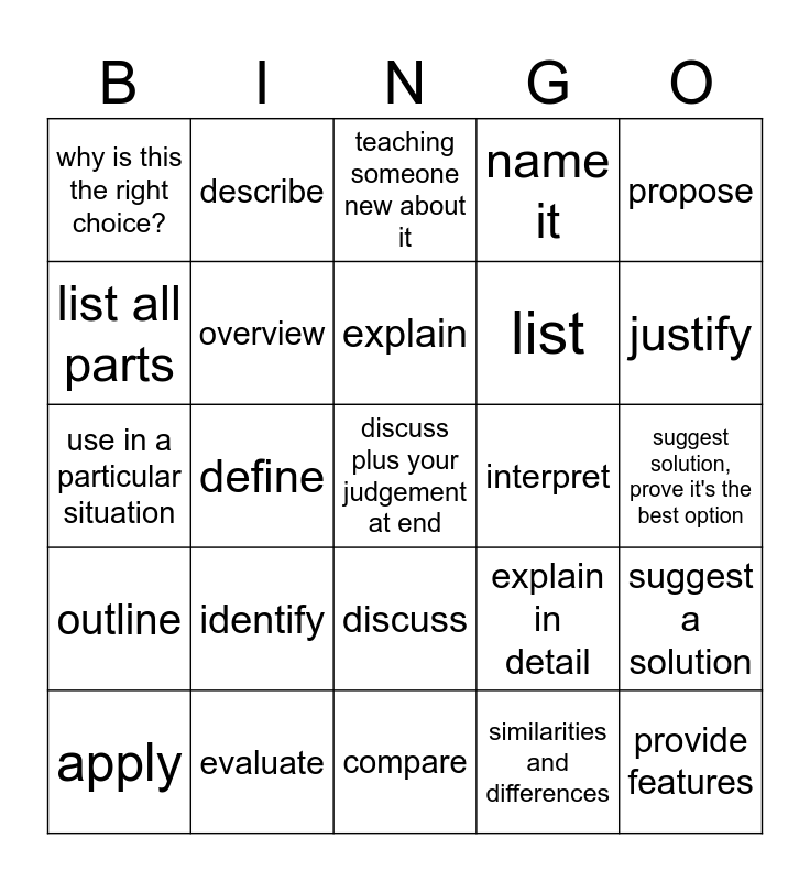 This bingo card has 32 words: similarities and differences, analyse, define, precise meaning, outline, overview, propose, suggest a solution, describe, provide features, explain, teaching someone new about it, distinguish, make differences clear, interpret, process information, apply, use in a particular situation, discuss, identify, explain in detail, propose and justify, suggest solution, prove it's the best option, evaluate, discuss plus your judgement at end, name it, list, list all parts, why is this the right choice?, compare, strengths and weaknesses and justify.