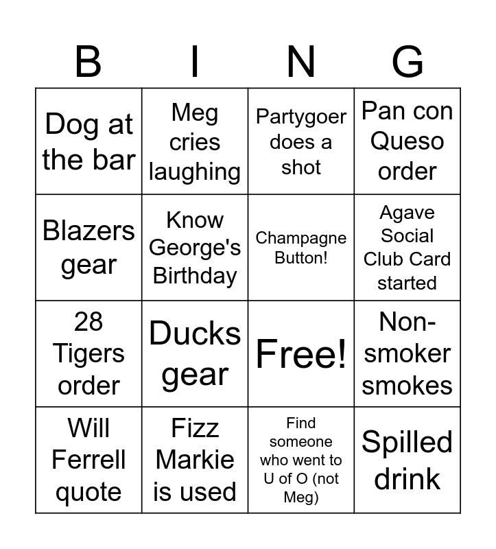 This bingo card has 21 words: Fizz Markie is used, George yells, Meg cries laughing, Find someone with an unconventional pet, Find someone who went to U of O (not Meg), Champagne Button!, Dog at the bar, Partygoer does a shot, Free!, Agave Social Club Card started, 28 Tigers order, Pan con Queso order, Spilled drink, Irish Goodbye, Know George's Birthday, Find someone who was at the wedding, Will Ferrell quote, Ducks gear, Blazers gear, Non-smoker smokes and Find someone who biked here.