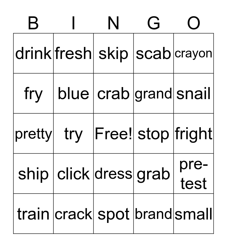 This bingo card has a free space and 26 words: dress, brand, crab, crack, crayon, drink, fry, fresh, fright, grab, grand, pretty, pre-test, train, try, slip, scab, ship, skip, small, snail, spot, stop, click, blue and fly.