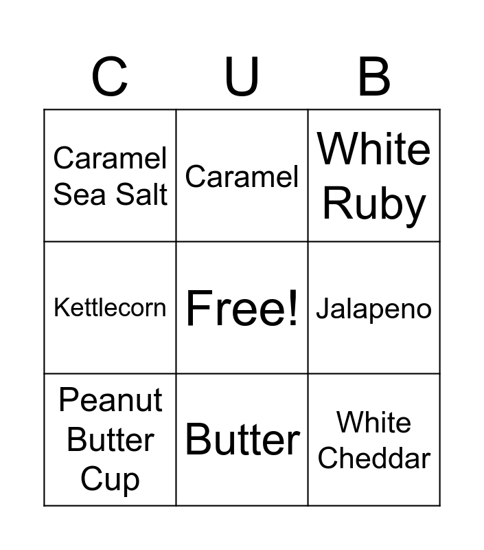 This bingo card has a free space and 8 words: Jalapeno, White Ruby, Caramel, Peanut Butter Cup, Caramel Sea Salt, White Cheddar, Kettlecorn and Butter.