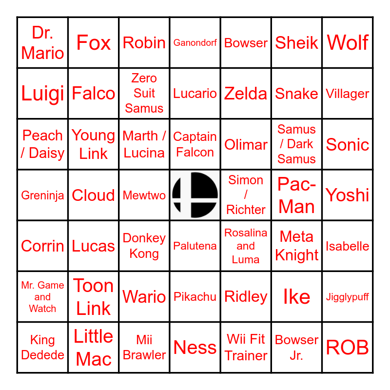 This bingo card has a free space and 67 words: Mario, Donkey Kong, Link, Samus / Dark Samus, Yoshi, Kirby, Fox, Pikachu, Luigi, Ness, Captain Falcon, Jigglypuff, Peach / Daisy, Bowser, Ice Climbers, Sheik, Zelda, Dr. Mario, Pichu, Falco, Marth / Lucina, Young Link, Ganondorf, Mewtwo, Roy / Chrom, Mr. Game and Watch, Meta Knight, Pit / Dark Pit, Zero Suit Samus, Wario, Snake, Ike, Squirtle / Ivysaur / Charizard, Diddy Kong, Lucas, Sonic, King Dedede, Olimar, Lucario, ROB, Toon Link, Wolf, Villager, Mega Man, Wii Fit Trainer, Rosalina and Luma, Little Mac, Greninja, Palutena, Pac-Man, Robin, Shulk, Bowser Jr., Duck Hunt, Ryu / Ken, Cloud, Corrin, Bayonetta, Inkling, Ridley, Simon / Richter, King K. Rool, Isabelle, Incineroar, Mii Brawler, Mii Swordfighter and Mii Gunner.
