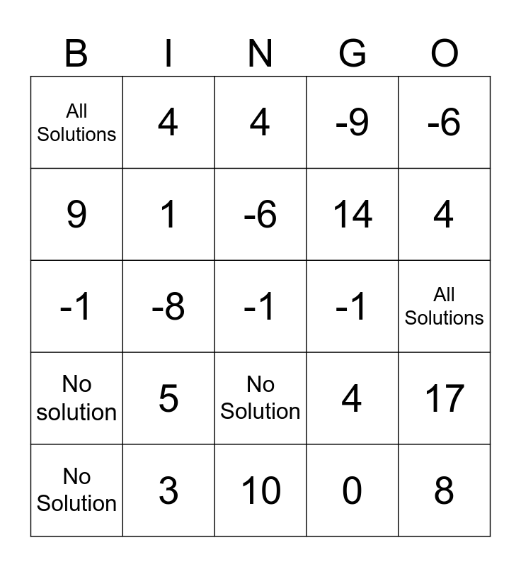 This bingo card has a free space and 34 words: 2, 0, -7, 0, No solution, 1, -6, No Solution, 4, 0, -6, 4, 4, 3, -1, 4, 3, -1, 5, 4, No Solution, -5, All Solutions, All Solutions, 10, 8, -9, 5, 14, 9, -10, -8, 17 and -2.