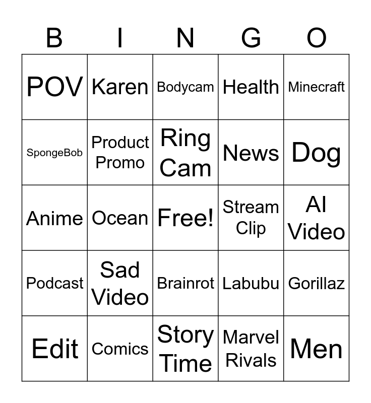 This bingo card has a free space and 34 words: Prank, Marvel Rivals, One Piece, Liuss Laughs, Podcast, Product Promo, Minecraft, Edit, Karen, Politics, Ring Cam, Bodycam, Cat, Halloween, Stream Clip, Dog, Comics, Anime, Sad Video, Labubu, Brainrot, Under 100 Likes, POV, AI Video, Story Time, Men, Health, Falling, News, SpongeBob, Japan, Ocean, Gorillaz and Twitch Clip.