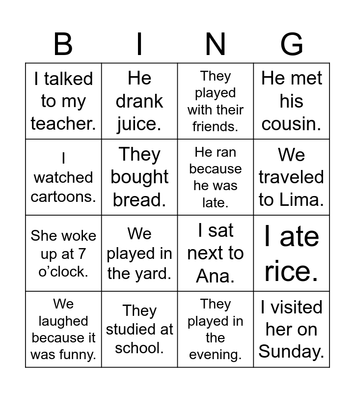 This bingo card has 20 words: I ate rice., She went to the park., They played with their friends., He did it in the afternoon., We laughed because it was funny., I watched cartoons., They studied at school., I talked to my teacher., She woke up at 7 o’clock., He drank juice., We played in the yard., I sat next to Ana., They bought bread., I visited her on Sunday., He ran because he was late., She wrote sentences., We traveled to Lima., He met his cousin., They played in the evening. and I had bread and milk..