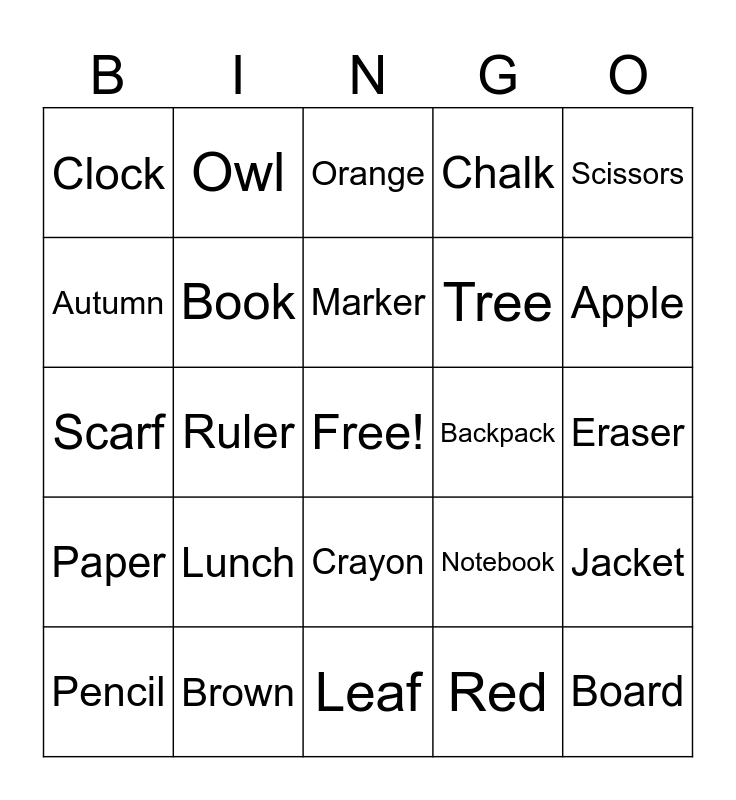 This bingo card has a free space and 39 words: Teacher, Student, Desk, Book, Pencil, Crayon, Marker, Glue, Scissors, Paper, Ruler, Chalk, Board, Eraser, Backpack, Lunch, Recess, Clock, Bus, Notebook, Autumn, Leaf, Tree, Apple, Pumpkin, Pie, Corn, Acorn, Hay, Owl, Wind, Cool, Orange, Brown, Red, Yellow, Jacket, Scarf and Football.