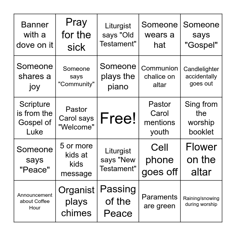 This bingo card has a free space and 42 words: Reading from the Psalms, Someone plays the piano, Someone plays an instrument other than piano, 5 or more kids at kids message, Paraments are green, Flower on the altar, Raining/snowing during worship, Pastor says "Angel", Liturgist says "Old Testament", Liturgist says "New Testament", Sing from the worship booklet, Candlelighter accidentally goes out, Pastor Carol says "Welcome", Someone says "Gospel", Pray the Lord's Prayer, Cell phone goes off, Talk to a person you don't know, Scripture is from the Gospel of Luke, At least 3 kids share during the kids message, Pray for the sick, Someone shares a joy, Pastor reads a poem, Pastor references a song, Banner with a dove on it, Someone mentions sheep/lambs, Communion Sunday, Communion chalice on altar, Someone offers you a bulletin, An adult greets you, You greet an adult, Someone says "Love", Someone says "Peace", Someone says "Community", Passing of the Peace, A hymn with "Water" in it, Announcement about Coffee Hour, Organist plays chimes, Pastor Carol mentions youth, Pastor Carol says "Grace", Adult says "I'd like to invite the children forward", Someone wears a hat and Special item on the altar (not flowers/chalice).