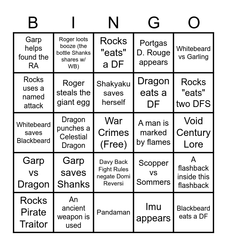 This bingo card has a free space and 24 words: Garp saves Shanks, An ancient weapon is used, Shakyaku saves herself, Rocks Pirate Traitor, Whitebeard vs Garling, Garp helps found the RA, Rocks uses a named attack, Roger loots booze (the bottle Shanks shares w/ WB), A man is marked by flames, Davy Back Fight Rules negate Domi Reversi, Dragon eats a DF, Whitebeard saves Blackbeard, Scopper vs Sommers, A flashback inside this flashback, Roger steals the giant egg, Imu appears, Void Century Lore, Rocks "eats" a DF, Rocks "eats" two DFS, Dragon punches a Celestial Dragon, Blackbeard eats a DF, Garp vs Dragon, Portgas D. Rouge appears and Pandaman.