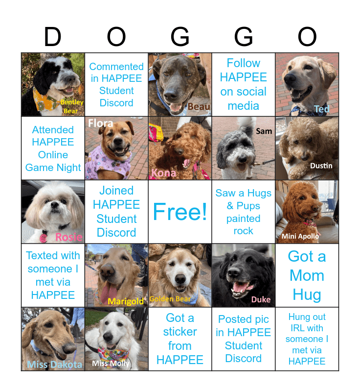 This bingo card has 14 images, a free space and 10 words: Attended HAPPEE Online Game Night, Commented in HAPPEE Student Discord, Saw a Hugs & Pups painted rock, Got a Mom Hug, Posted pic in HAPPEE Student Discord, Joined HAPPEE Student Discord, Hung out IRL with someone I met via HAPPEE, Texted with someone I met via HAPPEE, Follow HAPPEE on social media and Got a sticker from HAPPEE.
