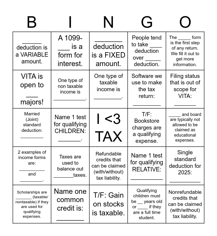 This bingo card has a free space and 24 words: Taxes are used to balance out _______taxes., Name one common credit is: _______, One type of taxable income is _________., Scholarships are _______ (taxable/ nontaxable) if they are used for qualifying expenses., The _____ form is the first step of any return. We fill it out to get more information., ______ deduction is a VARIABLE amount., VITA is open to ___ majors!, A 1099-___ is a form for interest., T/F: Bookstore charges are a qualifying expense., Refundable credits that can be claimed (with/without) tax liability., Software we use to make the tax return: _________, Married (Joint) standard deduction: _________, Name 1 test for qualifying RELATIVE: __________, Single standard deduction for 2025: __________, One type of non taxable income is ____________., Qualifying children must be __ years old or ____ if they are a full time student., _____ and board are typically not allowed to be claimed as educational expenses., _______ deduction is a FIXED amount., Filing status that is out of scope for VITA: _______, Name 1 test for qualifying CHILDREN: _______., Nonrefundable credits that can be claimed (with/without) tax liability., 2 examples of income forms are: __________ and _________., People tend to take ____ deduction over _____ deduction. and T/F: Gain on stocks is taxable..