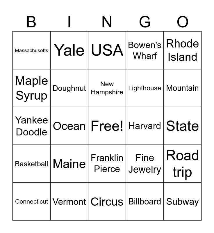 This bingo card has a free space and 24 words: Maine, Vermont, New Hampshire, Connecticut, Rhode Island, Massachusetts, Maple Syrup, Yale, Harvard, Franklin Pierce, Lighthouse, Yankee Doodle, Fine Jewelry, Road trip, Doughnut, Billboard, State, USA, Mountain, Ocean, Subway, Basketball, Bowen's Wharf and Circus.