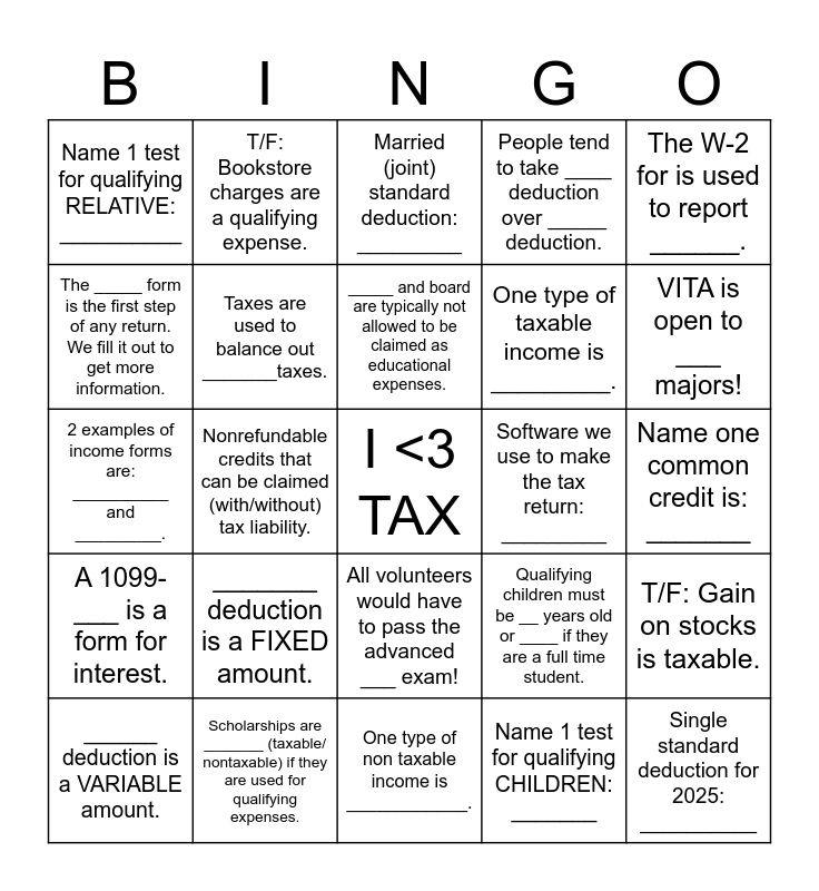 This bingo card has a free space and 27 words: Qualifying children must be __ years old or ____ if they are a full time student., Refundable credits that can be claimed (with/without) tax liability., One type of taxable income is _________., One type of non taxable income is ____________., The _____ form is the first step of any return. We fill it out to get more information., Married (joint) standard deduction: _________, T/F: Bookstore charges are a qualifying expense., A 1099- ___ is a form for interest., Software we use to make the tax return: _________, T/F: Gain on stocks is taxable., 2 examples of income forms are: __________ and _________., People tend to take ____ deduction over _____ deduction., ______ deduction is a VARIABLE amount., Scholarships are _______ (taxable/ nontaxable) if they are used for qualifying expenses., VITA is open to ___ majors!, Filing status that is out of scope for VITA: ______, Taxes are used to balance out _______taxes., _____ and board are typically not allowed to be claimed as educational expenses., _______ deduction is a FIXED amount., Name 1 test for qualifying RELATIVE: __________, Name one common credit is: _______, Name 1 test for qualifying CHILDREN: _______, Nonrefundable credits that can be claimed (with/without) tax liability., Single standard deduction for 2025: __________, All volunteers would have to pass the advanced ___ exam!, The W-2 for is used to report ______. and You should choose the deduction that results in the ______tax..