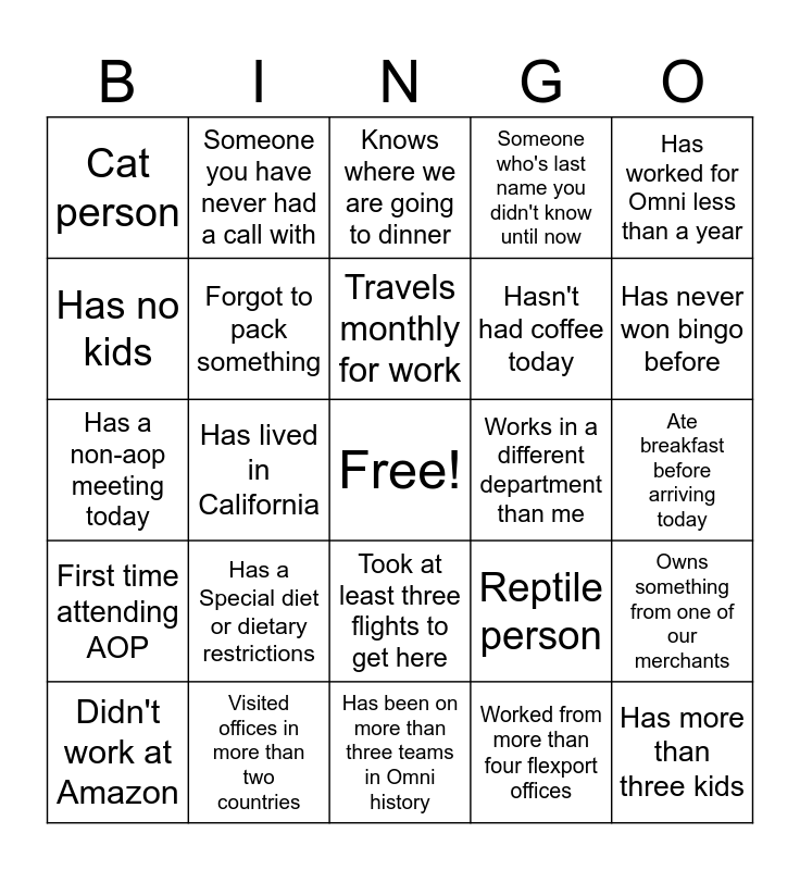 This bingo card has a free space and 29 words: Didn't work at Amazon, Has lived in Canada, Has lived in California, Huddle with someone attending AOP remotely, Cat person, Knows where we are going to dinner, Forgot to pack something, Has a Special diet or dietary restrictions, Works in a different department than me, Visited offices in more than two countries, Ate breakfast before arriving today, Has more than three kids, Has been on more than three teams in Omni history, Worked from more than four flexport offices, Has never won bingo before, Arrived in Dallas before Monday, Took at least three flights to get here, First time attending AOP, Has worked for Omni less than a year, Has a non-aop meeting today, Reptile person, Loves Mayo, Hasn't had coffee today, Has no kids, Someone who's last name you didn't know until now, Someone you have never had a call with, Owns something from one of our merchants, Travels monthly for work and Wasn't at the last annual planning.