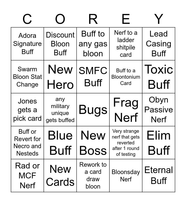 This bingo card has a free space and 24 words: Blue Buff, New Cards, SMFC Buff, Rad or MCF Nerf, Lead Casing Buff, Adora Signature Buff, Swarm Bloon Stat Change, Discount Bloon Buff, Frag Nerf, New Boss, Buff to a Bloontonium Card, Jones gets a pick card, Very strange nerf that gets reverted after 1 round of testing, Elim Buff, New Hero, Bloonsday Nerf, Obyn Passive Nerf, Buff to any gas bloon, Toxic Buff, any military unique gets buffed, Eternal Buff, Buff or Revert for Necro and Nesteds, Nerf to a ladder shitpile card and Rework to a card draw bloon.