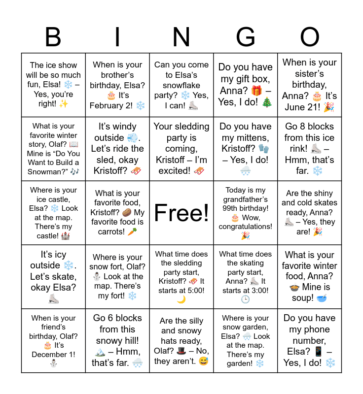 This bingo card has a free space and 33 words: What is your favorite treat, Anna? 🍫 My favorite treat is chocolate! 🍬, What is your favorite winter game, Olaf? ⛄ My favorite game is snowball fight! ❄️, What is your favorite food, Kristoff? 🥔 My favorite food is carrots! 🥕, It’s snowy outside 🌨️. Let’s build a snowman, okay Olaf? ⛄, It’s icy outside ❄️. Let’s skate, okay Elsa? ⛸️, It’s windy outside 💨. Let’s ride the sled, okay Kristoff? 🛷, When is your sister’s birthday, Anna? 🎂 It’s June 21! 🎉, When is your friend’s birthday, Olaf? 🎂 It’s December 1! ⛄, When is your brother’s birthday, Elsa? 🎂 It’s February 2! ❄️, Your winter party is coming, Anna – I’m happy about that! 🎄, Your sledding party is coming, Kristoff – I’m excited! 🛷, Can you come to Elsa’s snowflake party? ❄️ Yes, I can! ⛸️, Can you come to Olaf’s snowball party? ⛄ No, I can’t make it. 🌨️, Today is my grandmother’s 100th birthday! 🎂 Wow, congratulations! 🎊, Today is my grandfather’s 99th birthday! 🎂 Wow, congratulations! 🎉, Go 8 blocks from this ice rink! ⛸️ – Hmm, that’s far. ❄️, Go 6 blocks from this snowy hill! 🏔️ – Hmm, that’s far. 🌨️, Where is your ice castle, Elsa? ❄️ Look at the map. There’s my castle! 🏰, Where is your snow fort, Olaf? ⛄ Look at the map. There’s my fort! ❄️, What time does the skating party start, Anna? ⛸️ It starts at 3:00! 🕒, What time does the sledding party start, Kristoff? 🛷 It starts at 5:00! 🌙, The winter carnival will be so much fun, Sven! 🦌 – Yes, you’re right! 🎄, The ice show will be so much fun, Elsa! ❄️ – Yes, you’re right! ✨, Are the shiny and cold skates ready, Anna? ⛸️ – Yes, they are! 🎉, Are the silly and snowy hats ready, Olaf? 🎩 – No, they aren’t. 😅, Do you have my phone number, Elsa? 📱 – Yes, I do! ❄️, Do you have my gift box, Anna? 🎁 – Yes, I do! 🎄, Do you have my mittens, Kristoff? 🧤 – Yes, I do! 🌨️, What is your favorite winter story, Olaf? 📖 Mine is “Do You Want to Build a Snowman?” 🎶, What is your favorite winter food, Anna? 🍲 Mine is soup! 🥣, What is your favorite winter sound, Sven? 🔔 Mine is jingling bells! 🎶, Where is your snow garden, Elsa? 🌨️ Look at the map. There’s my garden! ❄️ and Your skating party is coming, Olaf – I’m happy about that! ⛸️🎉.