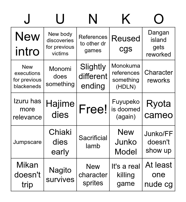 This bingo card has a free space and 24 words: Chiaki dies early, Nagito survives, Slightly different ending, Mikan doesn't trip, Dangan island gets reworked, New intro, New executions for previous blackeneds, New body discoveries for previous victims, Fuyupeko is doomed (again), Sacrificial lamb, Monokuma references something (HDLN), Izuru has more relevance, New Junko Model, Junko/FF doesn't show up, Monomi does something, It's a real killing game, Ryota cameo, References to other dr games, Character reworks, Hajime dies, At least one nude cg, Jumpscare, Reused cgs and New character sprites.
