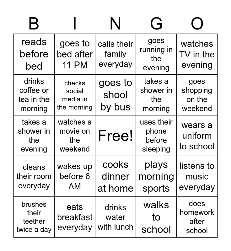 This bingo card has a free space and 24 words: wakes up before 6 AM, eats breakfast everyday, goes to shool by bus, brushes their teether twice a day, watches TV in the evening, reads before bed, drinks coffee or tea in the morning, goes to bed after 11 PM, uses their phone before sleeping, cooks dinner at home, takes a shower in the morning, takes a shower in the evening, plays morning sports, listens to music everyday, checks social media in the morning, walks to school, wears a uniform to school, calls their family everyday, goes shopping on the weekend, watches a movie on the weekend, does homework after school, cleans their room everyday, goes running in the evening and drinks water with lunch.