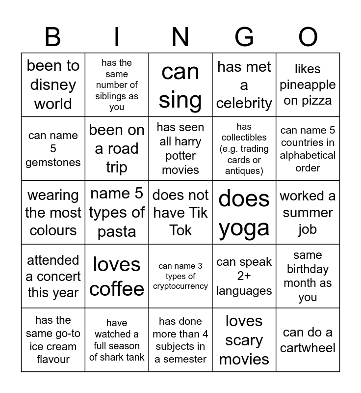 This bingo card has 30 words: has the same go-to ice cream flavour, likes to cook, has seen all harry potter movies, Does an extreme sport, likes pineapple on pizza, been to disney world, has the same number of siblings as you, can name 3 types of cryptocurrency, does yoga, can do a cartwheel, attended a concert this year, been on a road trip, What is the full name of ALTIC?, loves scary movies, same birthday month as you, wakes up before sunrise, name 5 types of pasta, does not have Tik Tok, can speak 2+ languages, can name 5 countries in alphabetical order, wearing the most colours, have watched a full season of shark tank, can sing, has collectibles (e.g. trading cards or antiques), worked a summer job, can name 5 gemstones, loves coffee, has done more than 4 subjects in a semester, has met a celebrity and has been to more than 3 continents.