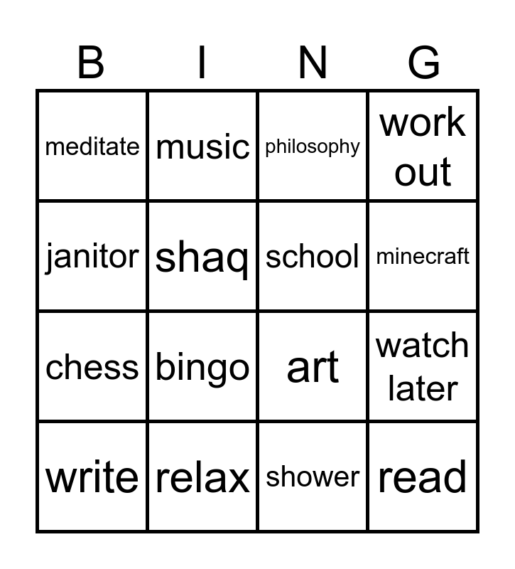 This bingo card has 16 words: relax, watch later, philosophy, meditate, chess, music, art, shower, janitor, shaq, write, work out, bingo, minecraft, school and read.
