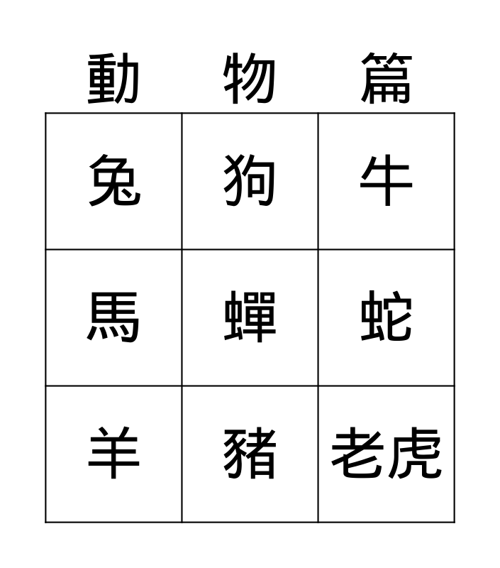 This bingo card has 9 words: 羊, 牛, 狗, 馬, 兔, 蛇, 蟬, 老虎 and 豬.