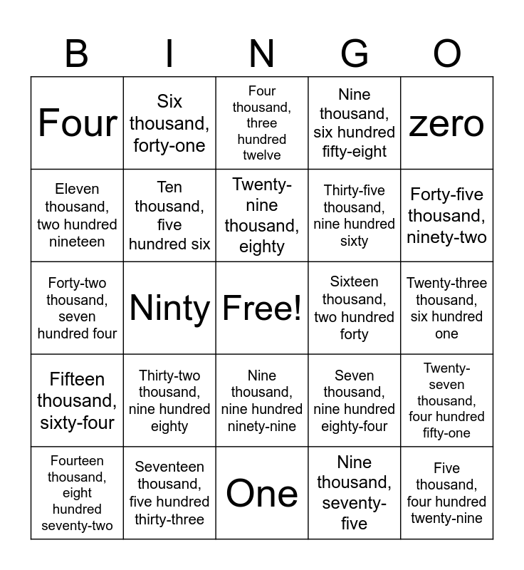 This bingo card has a free space and 31 words: One, Thirty-five, Ninty, Eighy-eight, Four, Four thousand, three hundred twelve, Ten thousand, five hundred six, Seven thousand, nine hundred eighty-four, Sixteen thousand, two hundred forty, Nine thousand, seventy-five, Twenty-three thousand, six hundred one, Five thousand, four hundred twenty-nine, Thirty-eight thousand, seven hundred ten, Twelve thousand, eight hundred fifty, Forty-five thousand, ninety-two, Eight thousand, six hundred thirty-seven, Twenty-seven thousand, four hundred fifty-one, Thirty-two thousand, nine hundred eighty, Fifteen thousand, sixty-four, Nine thousand, nine hundred ninety-nine, zero, Twenty-one thousand, three hundred five, Fourteen thousand, eight hundred seventy-two, Six thousand, forty-one, Thirty-five thousand, nine hundred sixty, Eleven thousand, two hundred nineteen, Nine thousand, six hundred fifty-eight, Forty-two thousand, seven hundred four, Seventeen thousand, five hundred thirty-three, Twenty-nine thousand, eighty and Eight thousand, two hundred sixteen.