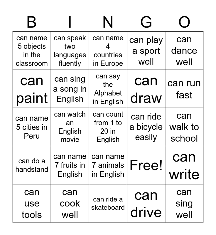 This bingo card has 25 words: can name 7 fruits in English, can ride a skateboard, can say the Alphabet in English, can use tools, can dance well, can name 5 objects in the classroom, can paint, can speak two languages fluently, can ride a bicycle easily, can name 7 animals in English, can draw, can name 5 cities in Peru, Free!, can write, can sing a song in English, can sing well, can walk to school, can name 4 countries in Europe, can run fast, can watch an English movie, can count from 1 to 20 in English, can cook well, can do a handstand, can play a sport well and can drive.