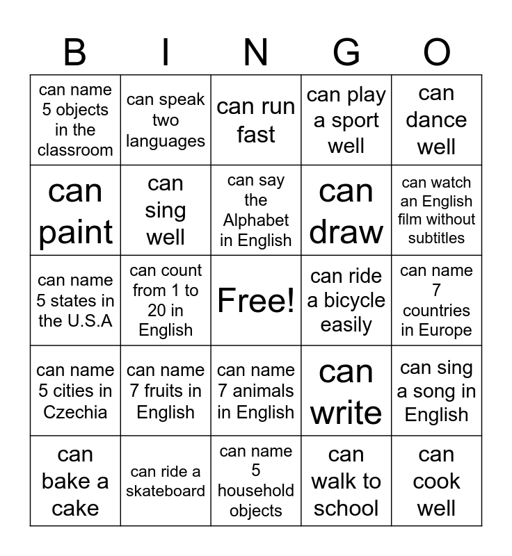 This bingo card has a free space and 24 words: can name 7 fruits in English, can ride a skateboard, can say the Alphabet in English, can bake a cake, can dance well, can name 5 objects in the classroom, can paint, can speak two languages, can ride a bicycle easily, can name 7 animals in English, can draw, can name 5 states in the U.S.A, can write, can sing a song in English, can sing well, can walk to school, can name 7 countries in Europe, can run fast, can watch an English film without subtitles, can count from 1 to 20 in English, can cook well, can name 5 cities in Czechia, can play a sport well and can name 5 household objects.