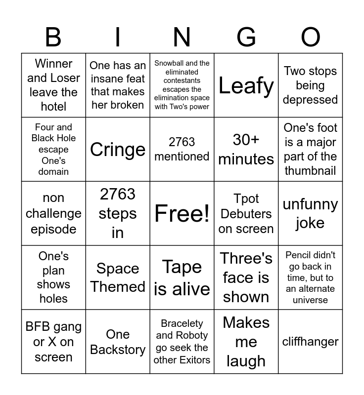 This bingo card has a free space and 24 words: Space Themed, One Backstory, 2763 mentioned, BFB gang or X on screen, Two stops being depressed, Winner and Loser leave the hotel, Four and Black Hole escape One's domain, One has an insane feat that makes her broken, Tpot Debuters on screen, Tape is alive, 30+ minutes, non challenge episode, Three's face is shown, Pencil didn't go back in time, but to an alternate universe, Cringe, Makes me laugh, unfunny joke, Snowball and the eliminated contestants escapes the elimination space with Two's power, One's foot is a major part of the thumbnail, 2763 steps in, cliffhanger, One's plan shows holes, Leafy and Bracelety and Roboty go seek the other Exitors.