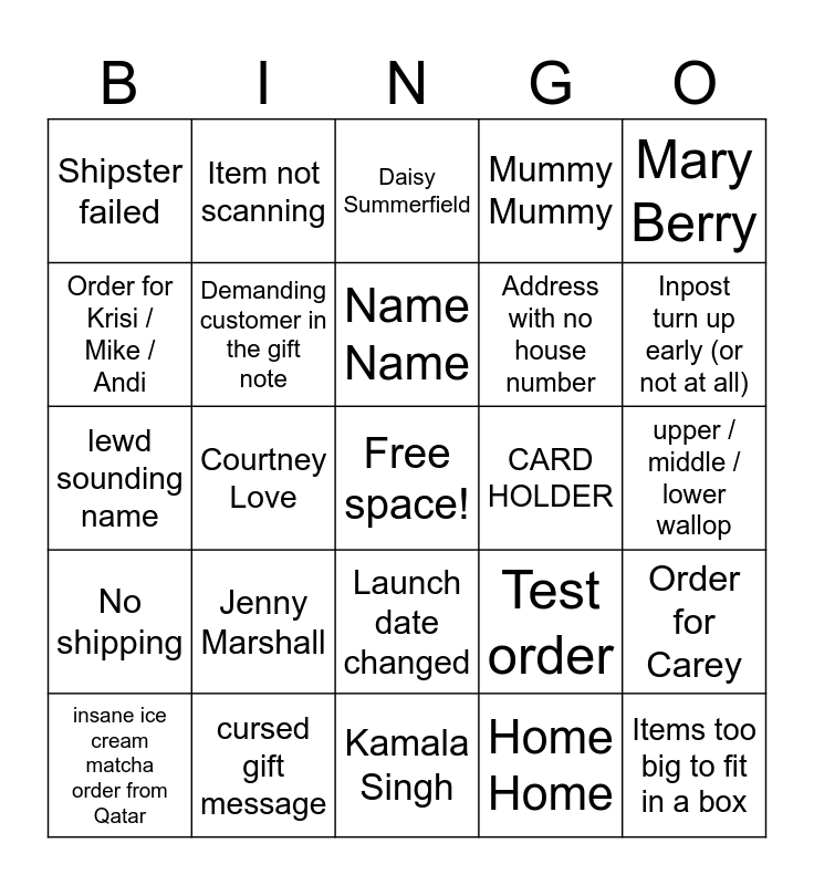 This bingo card has a free space and 24 words: Jenny Marshall, cursed gift message, Name Name, insane ice cream matcha order from Qatar, Mary Berry, Shipster failed, Order for Krisi / Mike / Andi, Item not scanning, CARD HOLDER, Launch date changed, Address with no house number, lewd sounding name, Test order, Order for Carey, Demanding customer in the gift note, Home Home, upper / middle / lower wallop, Daisy Summerfield, Inpost turn up early (or not at all), Courtney Love, Items too big to fit in a box, No shipping, Mummy Mummy and Kamala Singh.