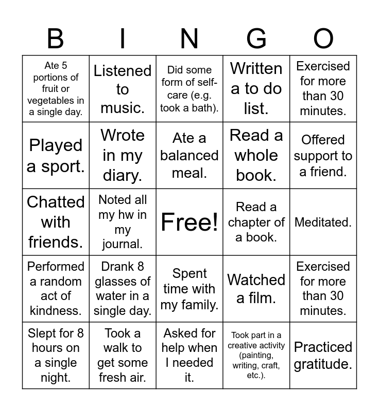 This bingo card has a free space and 24 words: Drank 8 glasses of water in a single day., Took a walk to get some fresh air., Ate a balanced meal., Slept for 8 hours on a single night., Exercised for more than 30 minutes., Ate 5 portions of fruit or vegetables in a single day., Played a sport., Listened to music., Read a chapter of a book., Spent time with my family., Read a whole book., Chatted with friends., Watched a film., Exercised for more than 30 minutes., Wrote in my diary., Took part in a creative activity (painting, writing, craft, etc.)., Meditated., Did some form of self-care (e.g. took a bath)., Offered support to a friend., Noted all my hw in my journal., Practiced gratitude., Performed a random act of kindness., Written a to do list. and Asked for help when I needed it..