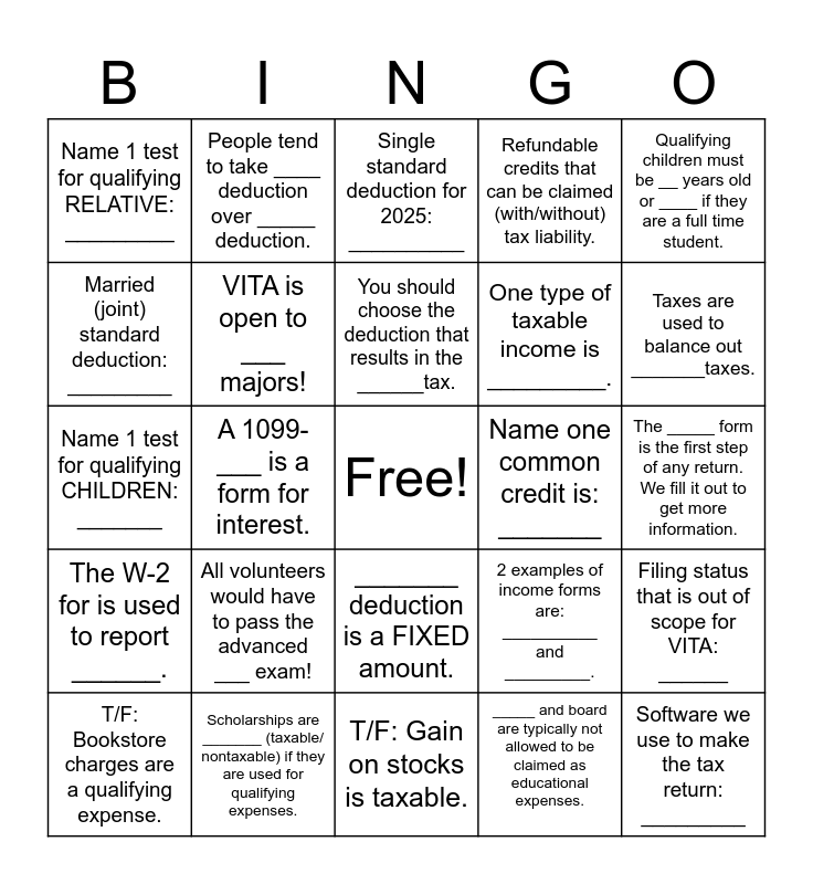 This bingo card has a free space and 27 words: 2 examples of income forms are: __________ and _________., ______ deduction is a VARIABLE amount., One type of taxable income is _________., T/F: Gain on stocks is taxable., Married (joint) standard deduction: _________, Single standard deduction for 2025: __________, People tend to take ____ deduction over _____ deduction., The W-2 for is used to report ______., Name one common credit is: _______, Filing status that is out of scope for VITA: ______, Name 1 test for qualifying CHILDREN: _______, Refundable credits that can be claimed (with/without) tax liability., T/F: Bookstore charges are a qualifying expense., Scholarships are _______ (taxable/ nontaxable) if they are used for qualifying expenses., Taxes are used to balance out _______taxes., Nonrefundable credits that can be claimed (with/without) tax liability., VITA is open to ___ majors!, You should choose the deduction that results in the ______tax., All volunteers would have to pass the advanced ___ exam!, Name 1 test for qualifying RELATIVE: _________, The _____ form is the first step of any return. We fill it out to get more information., _____ and board are typically not allowed to be claimed as educational expenses., A 1099- ___ is a form for interest., Software we use to make the tax return: _________, _______ deduction is a FIXED amount., Qualifying children must be __ years old or ____ if they are a full time student. and One type of non taxable income is ____________..