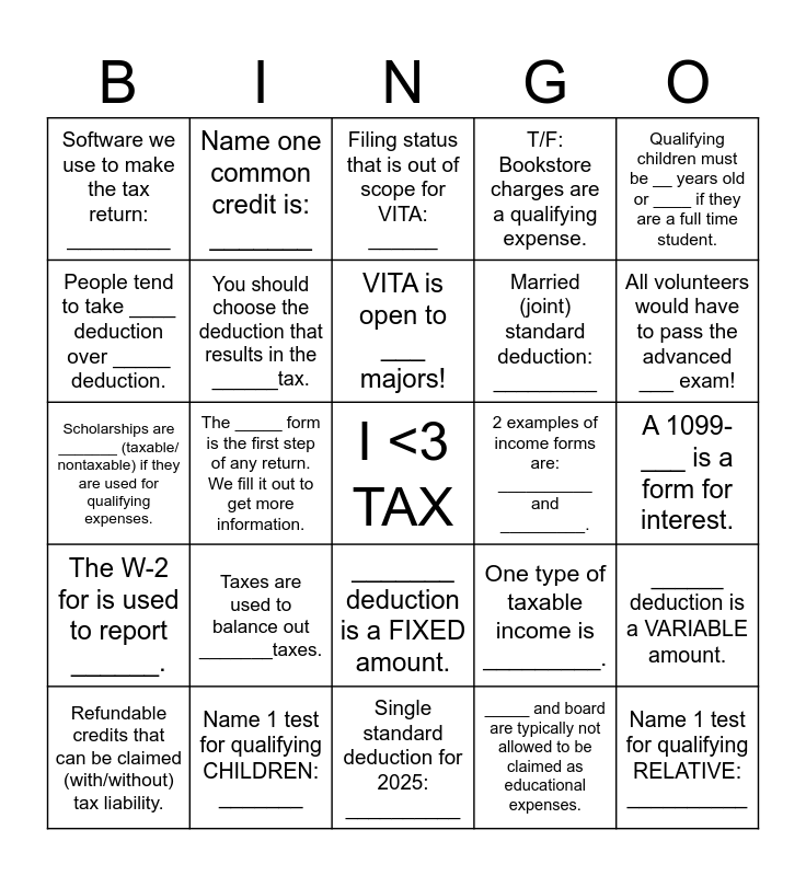 This bingo card has a free space and 27 words: One type of taxable income is _________., T/F: Gain on stocks is taxable., Married (joint) standard deduction: _________, Single standard deduction for 2025: __________, People tend to take ____ deduction over _____ deduction., Filing status that is out of scope for VITA: ______, Name one common credit is: _______, The W-2 for is used to report ______., 2 examples of income forms are: __________ and _________., ______ deduction is a VARIABLE amount., Scholarships are _______ (taxable/ nontaxable) if they are used for qualifying expenses., T/F: Bookstore charges are a qualifying expense., Refundable credits that can be claimed (with/without) tax liability., Name 1 test for qualifying CHILDREN: _______, All volunteers would have to pass the advanced ___ exam!, Nonrefundable credits that can be claimed (with/without) tax liability., You should choose the deduction that results in the ______tax., VITA is open to ___ majors!, Taxes are used to balance out _______taxes., Software we use to make the tax return: _________, A 1099- ___ is a form for interest., _____ and board are typically not allowed to be claimed as educational expenses., The _____ form is the first step of any return. We fill it out to get more information., Name 1 test for qualifying RELATIVE: __________, _______ deduction is a FIXED amount., Qualifying children must be __ years old or ____ if they are a full time student. and One type of non taxable income is ____________..