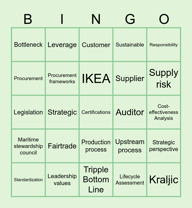 This bingo card has a free space and 24 words: Fairtrade, Leadership values, IKEA, Standardization, Responsibility, Bottleneck, Procurement, Leverage, Auditor, Production process, Supplier, Legislation, Upstream process, Strategic perspective, Procurement frameworks, Lifecycle Assessment, Cost-effectiveness Analysis, Customer, Supply risk, Strategic, Kraljic, Maritime stewardship council, Sustainable and Tripple Bottom Line.