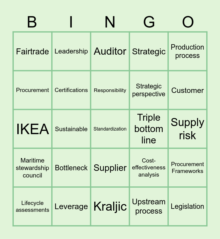 This bingo card has a free space and 24 words: Bottleneck, Leverage, Responsibility, Lifecycle assessments, Production process, Fairtrade, Procurement, Leadership, Triple bottom line, Supplier, Strategic perspective, IKEA, Cost-effectiveness analysis, Procurement Frameworks, Certifications, Upstream process, Supply risk, Auditor, Customer, Sustainable, Legislation, Maritime stewardship council, Strategic and Kraljic.