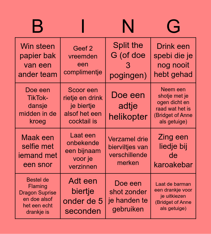 This bingo card has 16 words: Adt een biertje onder de 5 seconden, Zing een liedje bij de karoakebar, Split the G (of doe 3 pogingen), Win steen papier bak van een ander team, Maak een selfie met iemand met een snor, Geef 2 vreemden een complimentje, Verzamel drie bierviltjes van verschillende merken, Doe een shot zonder je handen te gebruiken, Doe een TikTok-dansje midden in de kroeg, Scoor een rietje en drink je biertje alsof het een cocktail is, Bestel de Flaming Dragon Suprise en doe alsof het een echt drankje is, Drink een spebi die je nog nooit hebt gehad, Laat een onbekende een bijnaam voor je verzinnen, Neem een shotje met je ogen dicht en raad wat het is (Bridget of Anne als getuige), Doe een adtje helikopter and Laat de barman een drankje voor je uitkiezen (Bridget of Anne als getuige).