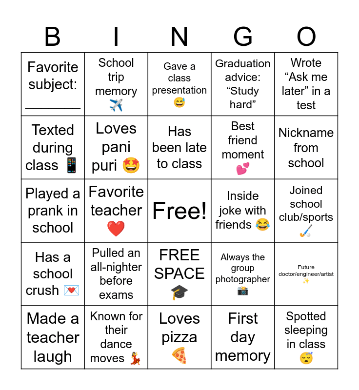 This bingo card has a free space and 25 words: Pulled an all-nighter before exams, Loves pizza ๐, Has been late to class, Made a teacher laugh, Wrote โAsk me laterโ in a test, Favorite subject: _______, Texted during class ๐ฑ, School trip memory โ๏ธ, Inside joke with friends ๐, FREE SPACE ๐, Best friend moment ๐, Played a prank in school, Always the group photographer ๐ธ, Future doctor/engineer/artist โจ, Loves pani puri ๐คฉ, Survived math class ๐งฎ, Joined school club/sports ๐, Gave a class presentation ๐ , Nickname from school, Favorite teacher โค๏ธ, Spotted sleeping in class ๐ด, Known for their dance moves ๐, Has a school crush ๐, Graduation advice: โStudy hardโ and First day memory.