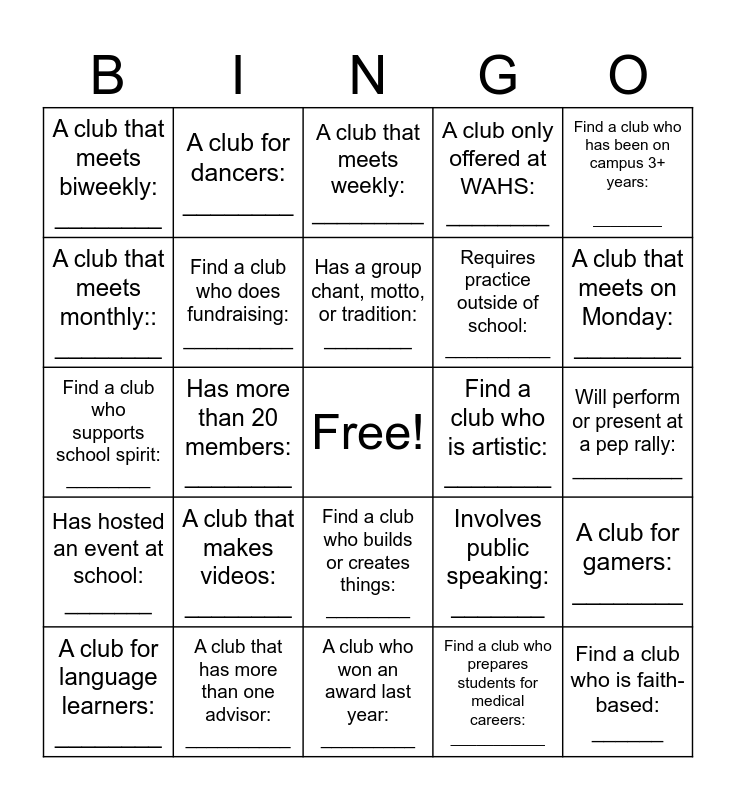 This bingo card has a free space and 43 words: A club you might join: _______, Has more than 20 members: ________, A club that meets on Thursday: ________, Find a club who prepares students for medical careers: ___________, A club that would help me prep for college: __________, A club for language learners: ________, Find a club who does fundraising: __________, Find a club who works as a team: ________, A club only offered at WAHS: ________, A club that helps plan events: ________, A club that meets biweekly: ________, A club that makes videos: ________, Involves public speaking: _______, A club for gamers: ________, A club where students are physically active: ________, Find a club who is focused on leadership: ________, A club to help others: ________, Find a club who is artistic: ________, Find a club who has competitions: __________, Find a club who supports school spirit: ________, A club for dancers: ________, A club for fashionistas: ________, Has their own social media page: _________, Find a club who has been on campus 3+ years: ________, Find a club who performs on stage: ________, A club that has more than one advisor: __________, Find a club who builds or creates things: ________, A club were I can explore a career goal: ________, Find a club who is faith-based: ______, Has hosted an event at school: _______, Partners with other school clubs: _______, Has a group chant, motto, or tradition: ________, Wears matching shirts or uniforms: ___________, Will perform or present at a pep rally: __________, Plans to travel this year: ________, Find a club who solves problems: _______, A club who won an award last year: _________, Requires practice outside of school: __________, A club that meets on Monday: ________, A club that meets monthly:: ________, A club that meets on Tuesday: ________, A club that meets weekly: _________ and A club that meets on Wednesday: ________.
