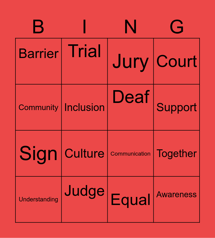 This bingo card has 21 words: Judge, Access, Trial, Respect, Equal, Deaf, Barrier, Jury, Communication, Support, Sign, Court, Awareness, Happy, Inclusion, Law, Understanding, Culture, Community, Together and Sharing.
