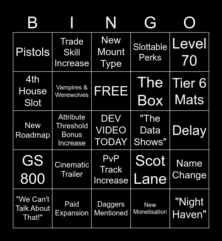 This bingo card has a free space and 24 words: "We Can't Talk About That!", Cinematic Trailer, FREE, New Monetisation, Level 70, Pistols, Trade Skill Increase, New Mount Type, "The Data Shows", Delay, New Roadmap, Vampires & Werewolves, Scot Lane, Name Change, 4th House Slot, Paid Expansion, Daggers Mentioned, Slottable Perks, Tier 6 Mats, GS 800, Attribute Threshold Bonus Increase, PvP Track Increase, The Box and "Night Haven".