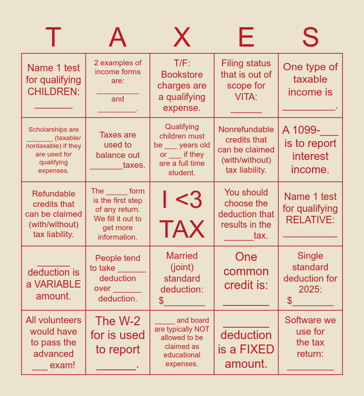 This bingo card has a free space and 26 words: Married (joint) standard deduction: $________, _______ deduction is a FIXED amount., Qualifying children must be ___ years old or ___ if they are a full time student., The W-2 for is used to report ______., One type of taxable income is _________., Name 1 test for qualifying CHILDREN: _______, Scholarships are _______ (taxable/ nontaxable) if they are used for qualifying expenses., 2 examples of income forms are: __________ and _________., Name 1 test for qualifying RELATIVE: __________, One common credit is: _______, Nonrefundable credits that can be claimed (with/without) tax liability., Refundable credits that can be claimed (with/without) tax liability., Single standard deduction for 2025: $________, All volunteers would have to pass the advanced ___ exam!, The _____ form is the first step of any return. We fill it out to get more information., T/F: Gain on stocks is taxable., Filing status that is out of scope for VITA: ______, ______ deduction is a VARIABLE amount., T/F: Bookstore charges are a qualifying expense., Software we use for the tax return: _________, A 1099-___ is to report interest income., _____ and board are typically NOT allowed to be claimed as educational expenses., You should choose the deduction that results in the ______tax., People tend to take ______ deduction over ______ deduction., Taxes are used to balance out _______taxes. and One type of nontaxable income is ____________..