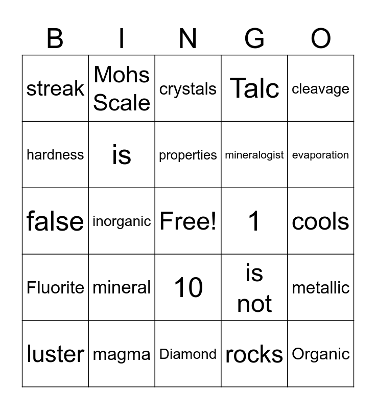 This bingo card has a free space and 24 words: mineral, magma, properties, luster, cleavage, streak, hardness, Mohs Scale, 1, 10, mineralogist, false, is not, metallic, is, rocks, cools, crystals, evaporation, inorganic, Organic, Fluorite, Talc and Diamond.